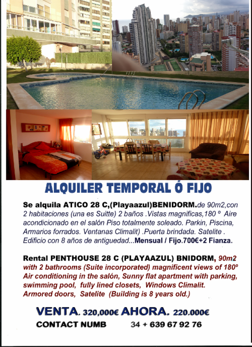 BENIDORM(Rincon de Loix) :Extraordinario apartamento, 90 m2. situado en una 28ª-Cplanta ,ED/ PLAYA AZUL, (Ático) zona del mediodía soleado, nuevototalmente, cocina con Vitro cerámica, nevera, lavadora nuevas, equipo de TV y música en el salón, Satélite, puerta blindada, armarios empotrados forrados interiormente, 3 camas, cortinas,cuadros, cristales dobles climalit, aire acondicionado frio y calor en el salón, persianas, etc.. 198.000 €.